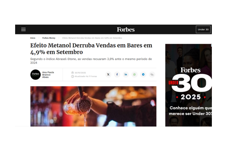 O consumo fora do lar sentiu o impacto da crise das bebidas adulteradas com metanol. Segundo o índice Abrasel-Stone, as vendas em bares e restaurantes caíram 4,9% em setembro — retração de 3,9% na comparação com o mesmo mês de 2024, após três meses de estabilidade.